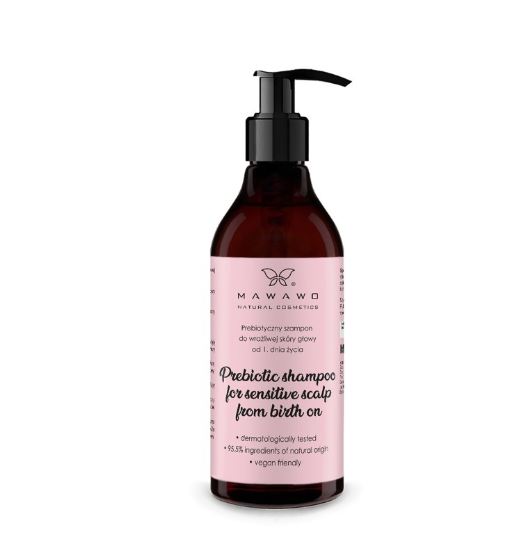 MAWAWO – Prebiotic shampoo for sensitive scalp from day 1 gently cleanses and nourishes the skin. Contains mild cleansing agents, prebiotics that strengthen the natural microflora, soothing allantoin and panthenol, and moisturizing arginine and vegetable glycerin.